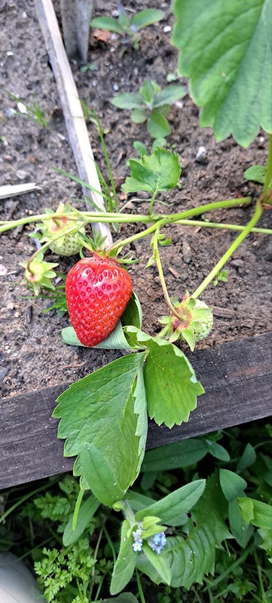 СЛАДКОЕ НА ВЕЧЕР. Первыми покраснели ягоды на клубника 🍓 🍓🍓"Мурано". Это те 3 кустика, которые мы купили в питомнике. Выглядели они на тот момент не очень. И поэтому мы купили только 3 штучки. Но, ничего - у неё уже появляются усы. Будем размножать. #мурано #клубника