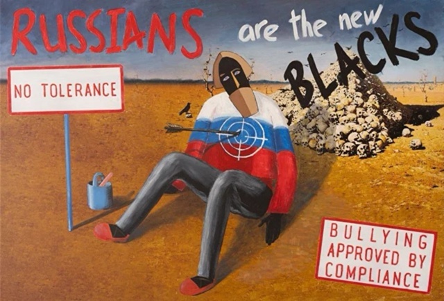 Разберём вкратце картину “Russian are the new Blacks” (Русские – это новые чёрные). Во-первых, этим заглавием заявлена критика дискриминации русских по национальному признаку, процветающая в ряде европейских стран. Турист, таким образом, сравнивает положение русских в современной Европе с положением негров в США вплоть до второй половины 60-х годов XX века. «No tolerance. Bullying approved by compliance». (Толерантность запрещена. Травля одобрена). Приглядимся к персонажу картины, пронзённому стрелой. Это не святой Себастьян, а русский художник. Его голова – отсылка к «крестьянскому циклу» Казимира Малевича. Рядом с ним стоит банка с краской. Значит, это он писал эти таблички? Выходит, что застреленный художник – это сам Турист, который тем самым пророчит себе незавидную участь активиста, убитого за критику европейской нетолерантности? На войне как на войне - за спиной русского человека – привет «Апофеозу войны» Верещагина. Ещё вспоминается выставка «Мишень», которую организовал Михаил Ларионов. Знаковое событие в истории русского авангарда. На ней не только был предствлен лучизм Ларионова, работы Гончаровой, Малевича… но и состоялся диспут о состоянии современного искусства, закончившийся скандалом. Кажется, поводом для драки стал перформанс выступавшего с трибуны Зданевича, когда оратор снял с ноги башмак, и заявил, что он, башмак, лучше Венеры Милосской. Завязалась потасовка, приехала полиция….