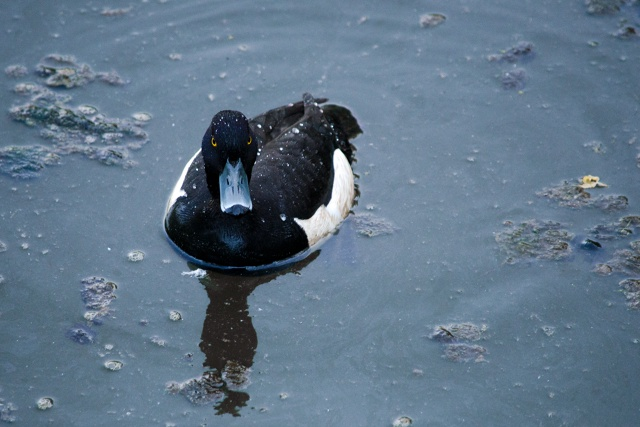 Вновь отвлечемся от городов, транспорта, искусства и иных мирских дел и обратим внимание на природу, хотя опять в черте Москвы. Авторский материал. "Орфография и стилистика автора преимущественно сохранены". Прогулка по паркам это всегда приятное времяпрепровождение. Например, можно насладится умиротворением леса: прохладный ветерок в летнюю пору и шум листвы очень успокаивают. А если говорить о том, что ещё окружает вокруг в парке, то можно заметить, что чаща полна неожиданностей. Прогуливаясь в тени деревьев парка Покровское-Стрешнево каждый раз я обязательно заглядываю в долину реки Химка. Мне очень нравится наблюдать за её неторопливым течением. И в этот раз, во время моих наблюдений в одной из заводей я увидел очень необычную утку. Голова у нее вся черная, да в целом ее тело не блещет красками, кроме редких полосок белого. А в этом что-то есть, подумал я доставая из рюкзака фотоаппарат. Пока я подготовил технику, к утке подплыла вторая. Ещё я нашел немного хлеба, и решил их чуть-ч