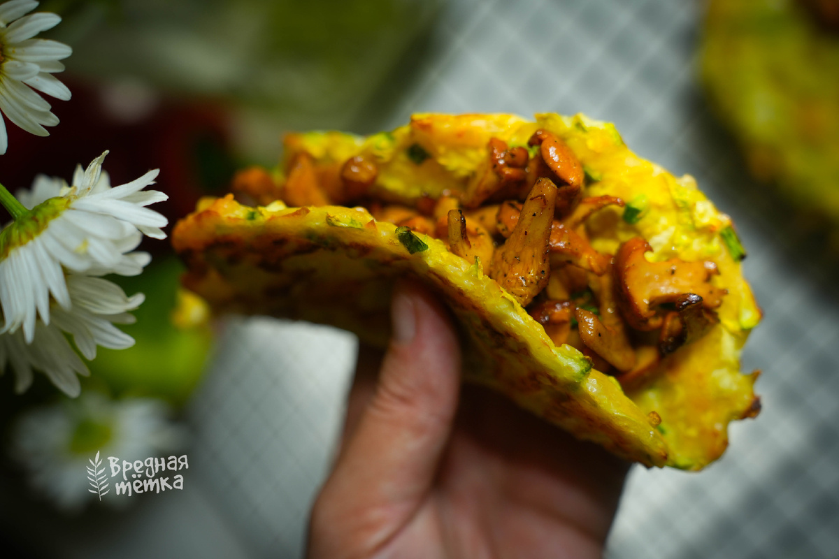 Обжарить лисички с чесноком, посолить по вкусу и приправить молотым перцем. Выложить на остывший блинчик. Можно в рулетик свернуть, а можно как такос. А вот подборка лисичковых