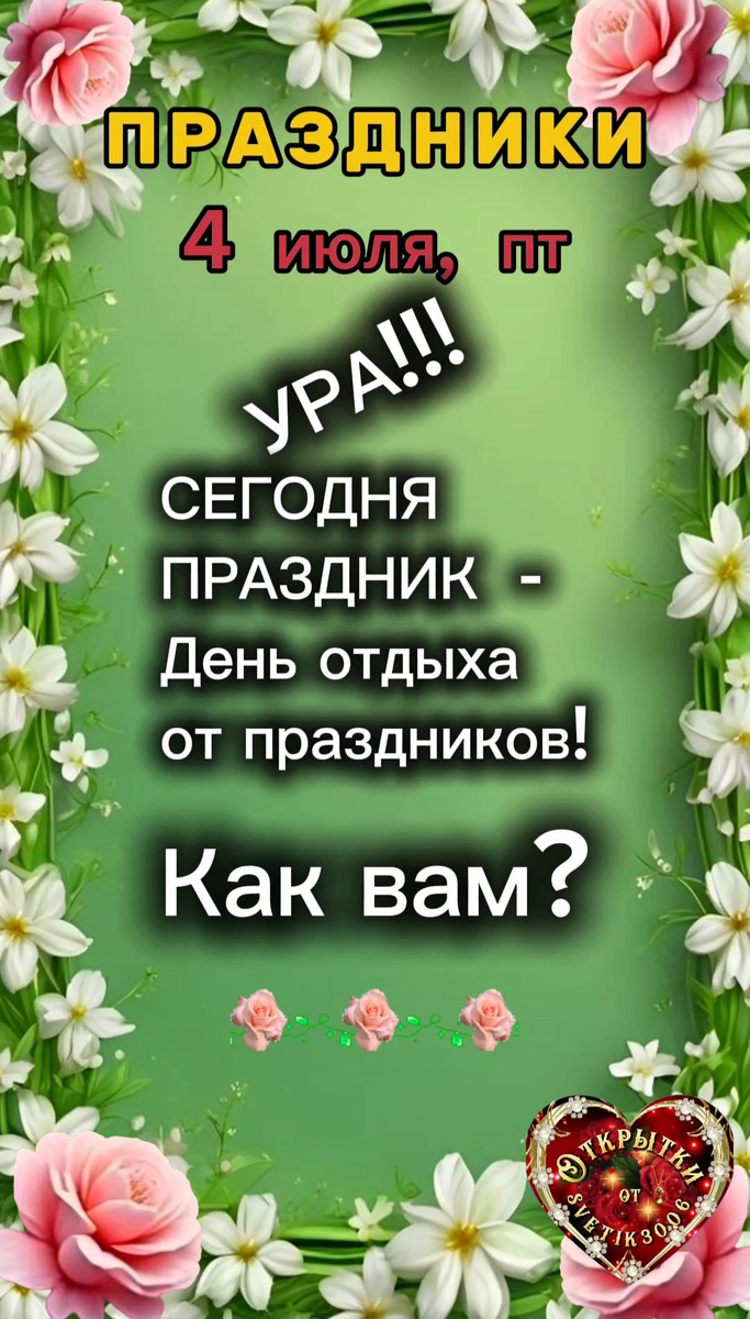 Уже давно не секрет, что каждый день в мире празднуется хоть какой-то праздник: международный, российский, профессиональный, народный, религиозный, забавный, именной, день рождения. И иногда так хочется отдохнуть от праздников. Хочется тишины и спокойствия. Вот именно поэтому и придумали такой праздник: День отдыха от праздников. Так что спокойно сегодня отдыхайте, но.... Не забывайте, что сегодня Пятница! А это хоть и небольшой, но все-таки Праздник! А как вы его отметите ( в тишине или веселой компании) зависит только от вас!