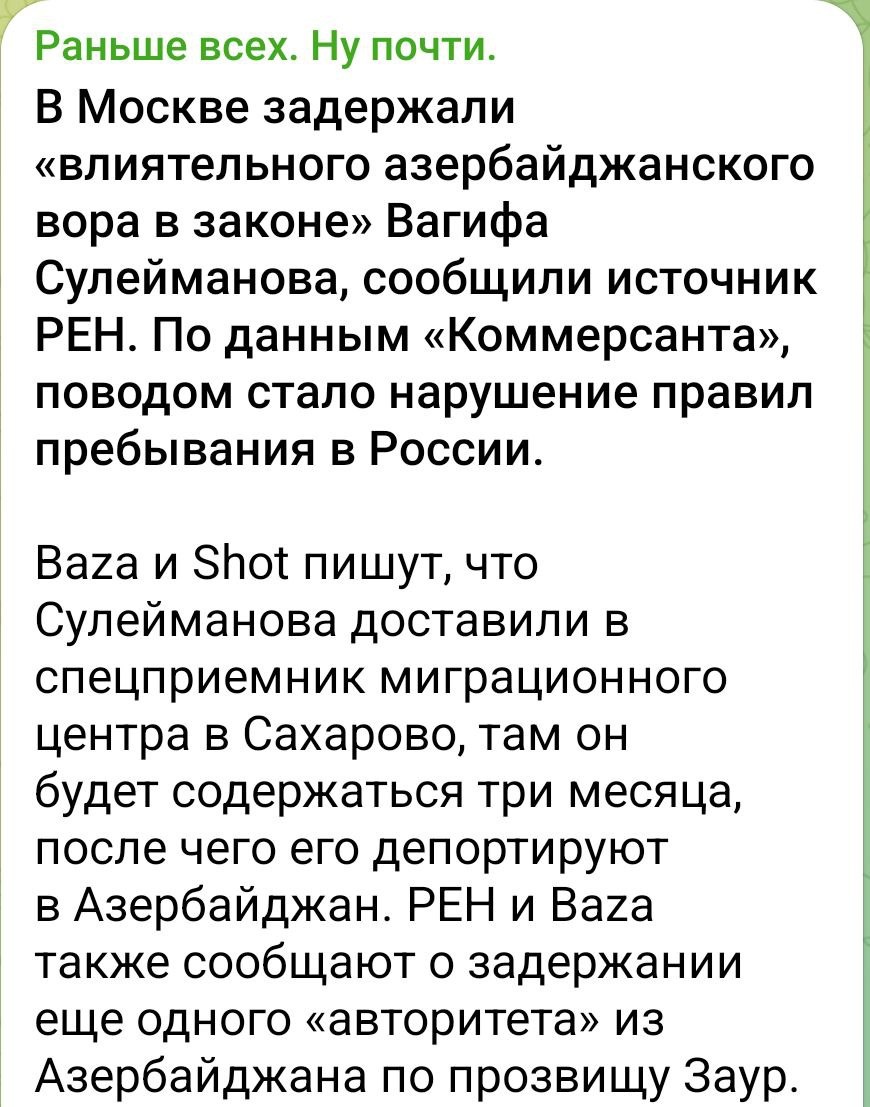Зря Ильхам Алиев так резко и на эмоциях сделал свой накат на Владимира Путина. В серьёзных делах необходимо просчитывать ходы, чтобы потом в минусы не уйти. С этим задержанием уже понятно, какая стратегия у нас будет в ближайшем будущем. Задержание и депортация всех криминальных или лиц состоящих на оперативном учёте будет на системной основе. Это даёт возможность переключить "серые", многомиллионные потоки сменой криминальной "крыши" (увы, но капиталистическая система именно так и работает), а у оппонентов из правоохранительных органов Азербайджана станет больше головной боли и проблем соответственно станет больше. Одно дело, когда при помощи своих симпотизиантов на чужой территории из криминальной среды шла доля в "родную гавань", но совсем другая история когда неподконтрольный элемент попытается уже в новых условиях обрести своё место под азербайджанским солнцем. А мы знаем как это бывает. Передел сфер влияния, ухудшение криминогенной обстановки, разборки, похищения, убийства и бан
