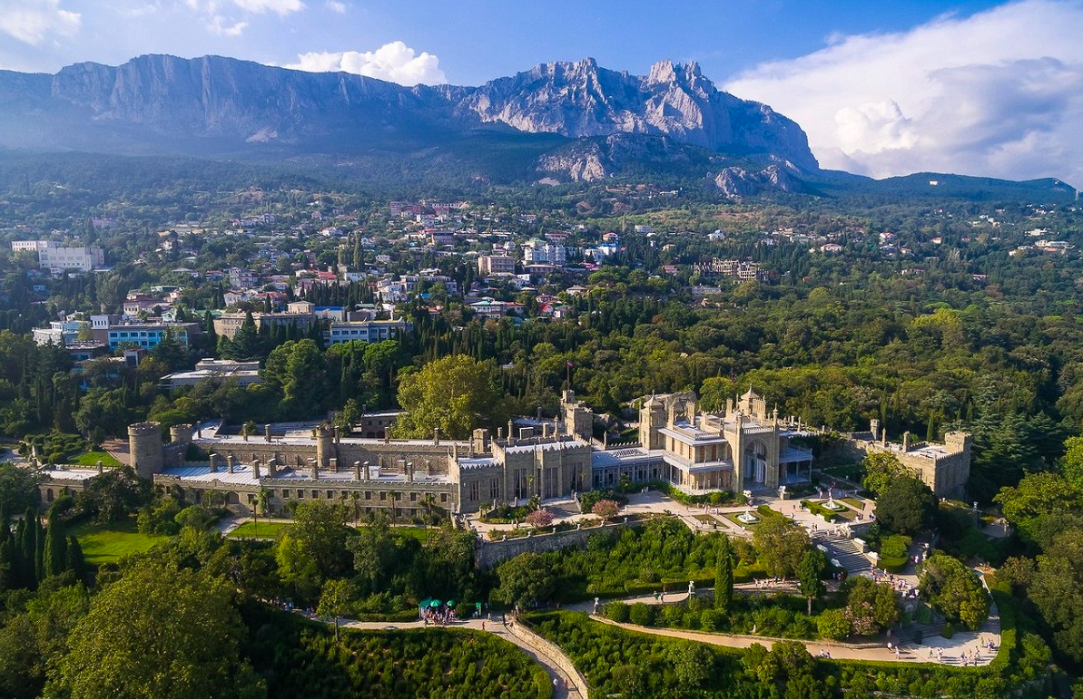 Своей формой он как бы повторяет абрис плато Ай-Петри, на фоне которого расположен. Сейчас на Южных террасах проводится реставрация, но это не мешает увидеть, как силуэт здания вторит рисунку гор: