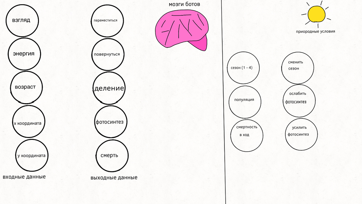 Итак, все здравствуйте, сегодня немного отойду от основной темы канала, и расскажу, как я начал планировать новый проект про цифровую жизнь. В мире будет по началу существовать какое то количество ботов, т.е. обитателей мира. Руководствоваться в своих любых действиях они будут на нейросеть у них в головах. По старту они имеют рандомные связи между нейронами, поэтому лишь немногие смогут прожить хотя бы чуть-чуть. Но, если они и выживут, им также придётся пережить условия мира, в котором они живут. Эти условия также руководствуются нейросети. Пока что нейроны есть только такие, так как самые простые в создании. Когда смогу реализовать это, перейду к обновлению системы. Из основного, хочу добавить возможность охоты, но совершенно не представляю как это можно реализовать. Заниматься этим мне предстоит на Unity, а, насколько понимаю, там это вполне возможно. По отдельности расскажу про все нейроны: Взгляд - что видит бот: сородича, бота другого вида или ничего не видит. Энергия - скольк