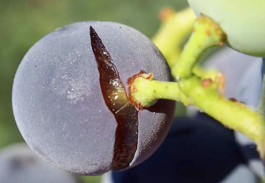 Резкие перепады влажности почвы — главная причина. Когда после засухи виноград обильно поливают или идут дожди, ягоды быстро набирают воду и лопаются.