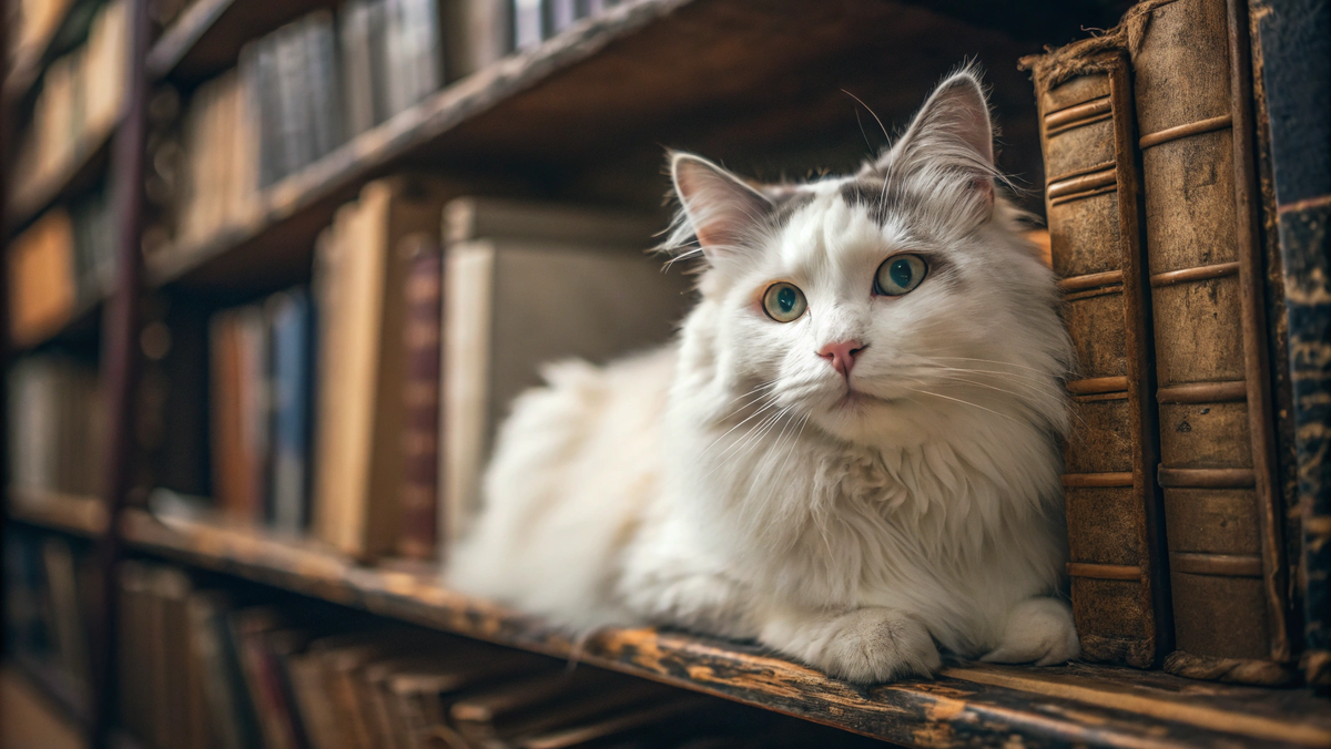 Я подняла голову от каталожных карточек. Пушок действительно лежал на полке с классикой, примостившись между томами. Белый, пушистый, с серыми пятнами. Увидел меня, зевнул и снова закрыл глаза.