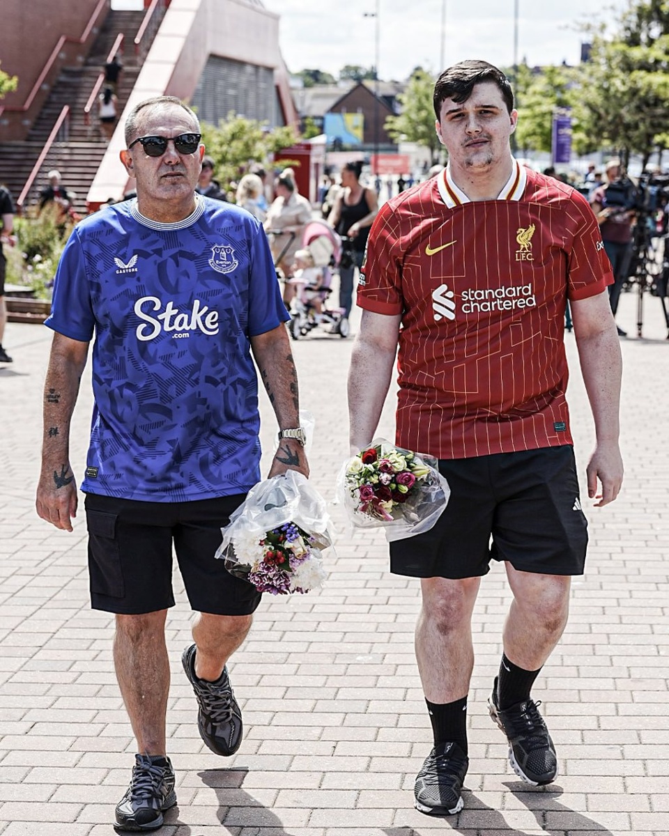 Болельщики заклятых соперников — «Эвертона» и «Ливерпуля» — вместе несут цветы на «Энфилд», чтобы почтить память погибшего в автокатастрофе Диогу Жоты.