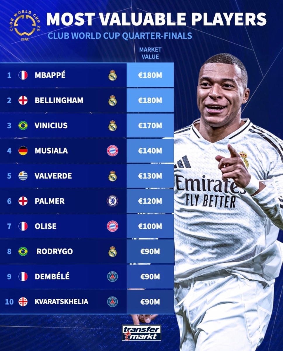 После финального обновления рыночных цен футболистов в сезоне-2024/25 Transfermarkt назвал самым дорогим игроком планеты Ламина Ямаля. Портал оценивает каталонского вундеркинда в 200 млн евро. Поскольку «Барселона» не участвует в текущем розыгрыше чемпионата мира среди клубов, на турнире в США лидером по трансферной стоимости стали Килиан Мбаппе и Джуд Беллингем, которых Transfermarkt оценивает в 180 млн евро. Портал составил список самых дорогих участников четвертьфинала КЧМ, помимо француза и англичанина в топ-10 вошли еще три игрока «Мадрида» – Винисиус (170 млн евро), Федерико Вальверде (130 млн евро) и Родриго (90 млн евро). Весь топ-3 заняли представители «королевского клуба», а следом идет звезда «Баварии» – Джамал Мусиала, чья стоимость в 140 млн евро позволила ему стать самым дорогим игроком Бундеслиги. Топ-10 самых дорогих игроков четвертьфинала КЧМ Как вам расценки? 🤑 Сборная самых дорогих игроков планеты. Кто за год подорожал больше остальных?