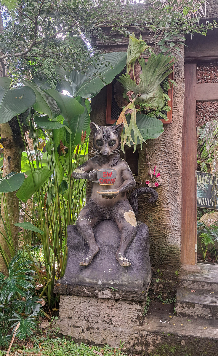 Лювак кофе считается одним из самых известных и дорогих сортов кофе в мире. Чем лювак отличается от обычного кофе - кофейные зерна зверёк съедает и они ферментируются у него в кишечнике с помощью живущих там бактерий. После ферментации, продукт получают естественным образом, очищают, обжаривают и делают готовый продукт. Подобный вариант изготовления встречали в Таиланде со слонами. Но не пробовали вкус слоновьего кофе. Зато привезли из той поездки рамку из очищенных остатков пищи животного. При входе нас встречают фигурки мусанга, того самого зверька. Территория, по которой нас провели с экскурсией, напомнила ботанический сад. Масса разнообразных растений, ухоженных и красиво подобранных, можно посмотреть здесь. Конечно же не обошлось без водоёма с карпами. В саду много разновидностей кофе. Арабика, робуста, представлены разные сорта. Помимо кофейных деревьев, здесь множество других разнообразных припав и специй :ваниль, корица, имбирь и т. д. Бедолага мусанг в одном количестве об
