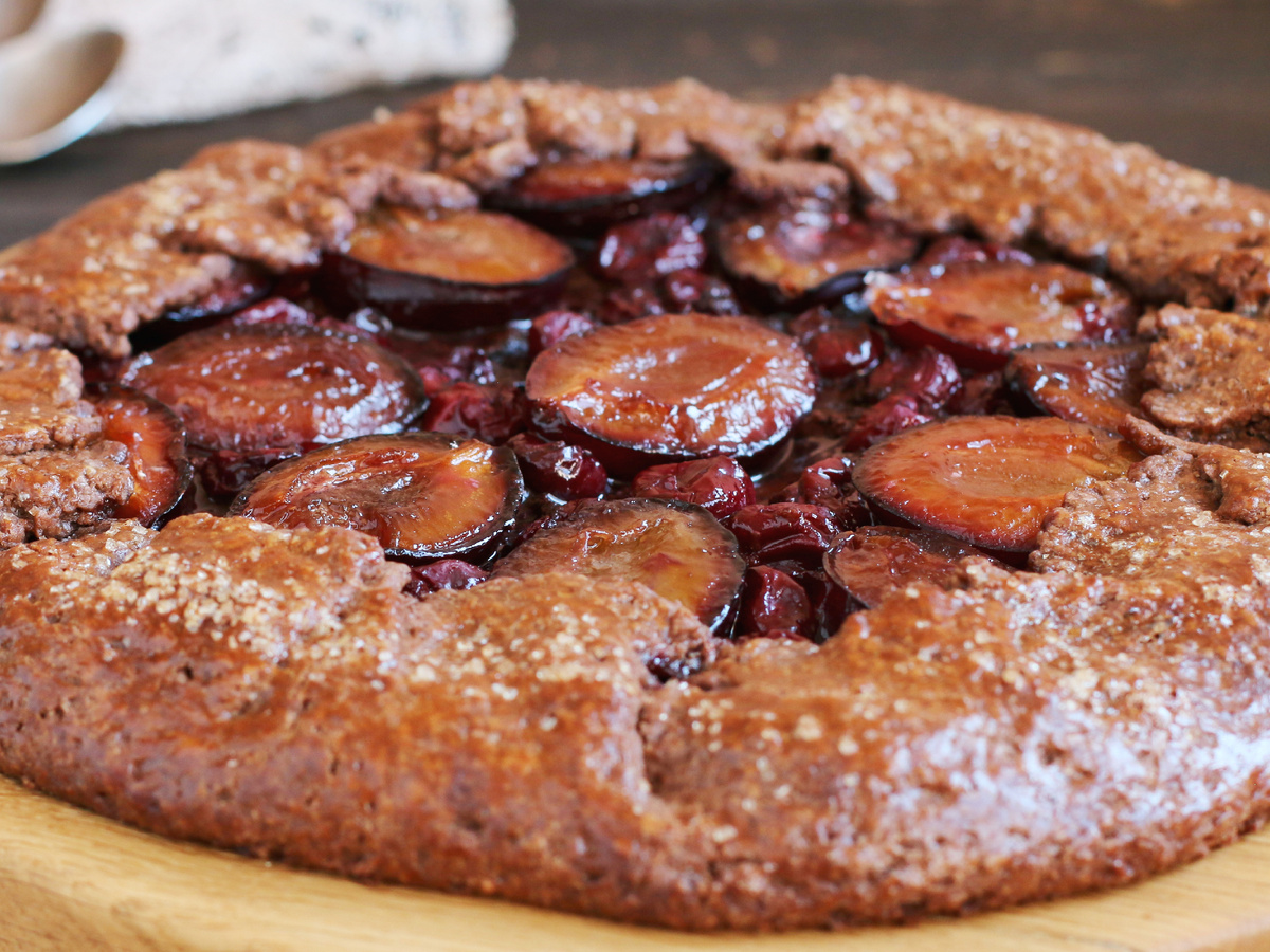 Какао в тесте и тёртый шоколад под начинкой. Тесто месить не надо, да и вообще, сделать его можно заранее – легко хранится в холодильнике хоть сутки. Фрукты подойдут любые, но вишня со сливой – классика – вместе они дают густую, сочную начинку, без подтёков. Сверху всё чуть карамелизуется от сахара и кусочков масла. При этом края теста хорошо запекаются, не мокнут, не ломаются – удобно и вкусно. Полный список ингредиентов – в конце⤵ Готовим шоколадное тесто. Сразу берём 140 г холодного сливочного масла, режем кубиками. В миску просеиваем 200 г муки, 30 г какао, 3 ст.л. сахара и 1/4 ч.л. соли. Перемешиваем. Добавляем масло. Быстро растираем всё вилкой или руками – до крошки. Сразу вливаем 6 ст.л. холодного молока. Собираем тесто в ком, не месим. Придаём форму диска, заворачиваем в плёнку и убираем в холодильник минимум на час. Пока тесто охлаждается, готовим начинку. Если ягоды замороженные – сливы (300 г) и вишню (200 г) размораживаем заранее, обязательно даём стечь лишнему соку.