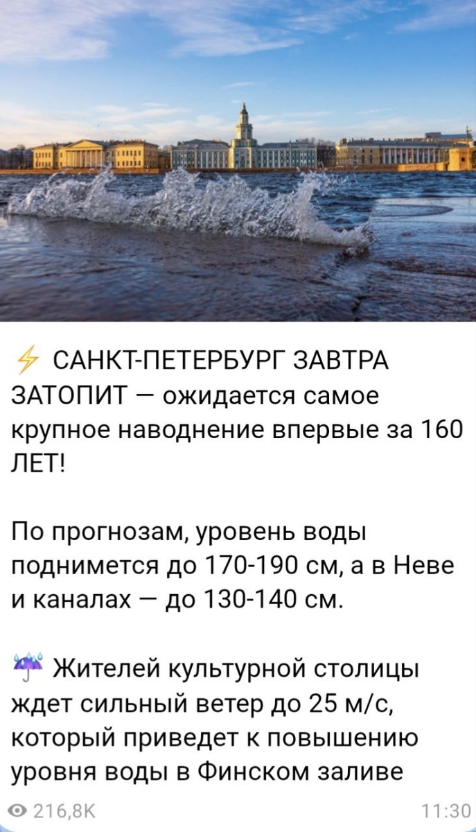 Санкт-Петербург завтра затопит! Завтра наш город столкнется с историческим событием — ожидается самое крупное наводнение за последние 160 лет 🌊 Синоптики предупреждают о сильном повышении уровня воды в Неве и других водоемах. Готовьтесь к возможным перебоям в транспортной системе 😵 #СанктПетербург #Наводнение #Безопасность