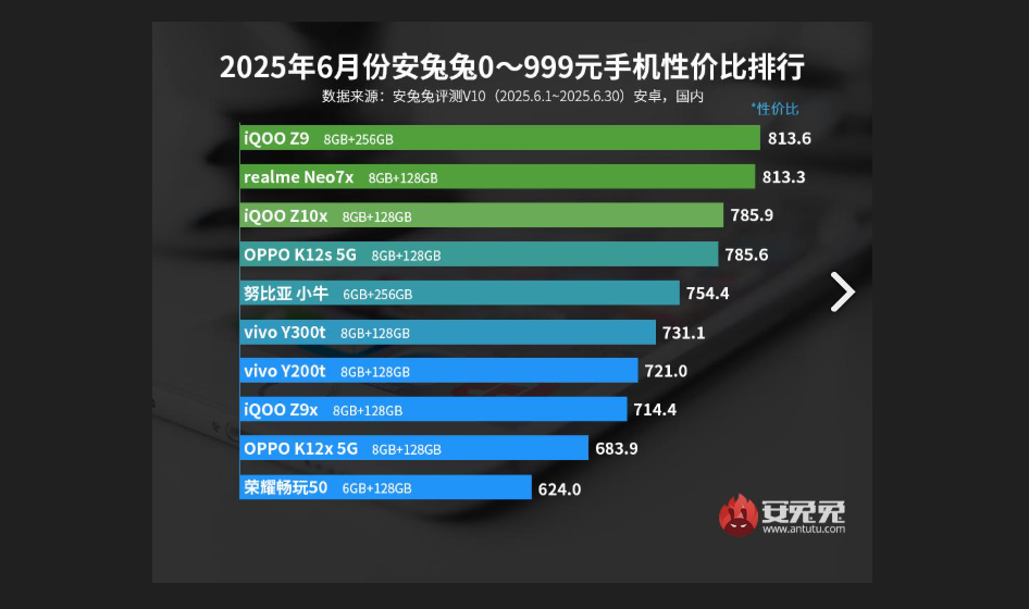AnTuTu представила рейтинг смартфонов с лучшим соотношением цены и производительности по версии пользователей за июнь. В обзоре охвачены пять ценовых категорий, начиная от $139, причём в лидерах оказались устройства как на процессорах MediaTek, так и Qualcomm. В бюджетном сегменте (до $139) уверенно лидирует iQOO Z9 с Snapdragon 7 Gen 3, опережая Realme Neo 7x на Snapdragon 6 Gen 4 и iQOO Z10x с Dimensity 7300. В средней ценовой категории ($139–279) первенство захватил iQOO Z9 Turbo+ на Dimensity 9300, оставив позади OnePlus Ace 5 Racing Edition (Dimensity 9400e) и Realme Neo 7 (Dimensity 9300+). Среди моделей в диапазоне $279–418 выделился OnePlus Ace 5 Extreme Edition с Dimensity 9400+, обогнав iQOO Neo10 Pro и Redmi K80 Ultra. В более премиальном сегменте ($418–558) доминирует Honor GT Pro с флагманским Snapdragon 8 Elite, тогда как OnePlus 13 и iQOO 13 с тем же чипом заняли второе и третье места соответственно. В топовом ценовом диапазоне (от $558) безоговорочным лидером стал Red M
