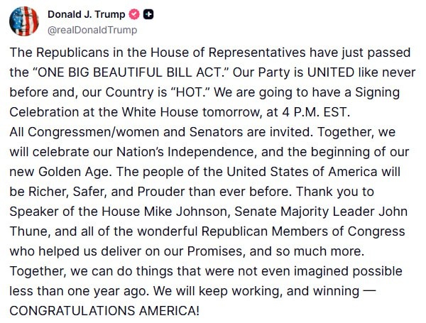 Trump says he’ll sign BBB at 4pm on Independence Day
