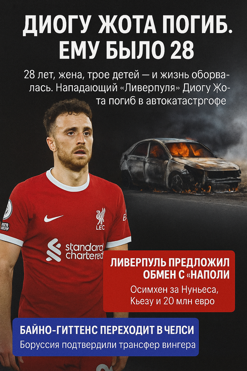 28-летний нападающий «Ливерпуля» и сборной Португалии Диогу Жота погиб в автокатастрофе в Испании. Вместе с ним в машине находился его младший брат Андре Силва, игрок «Пенафиела». Оба погибли на месте — автомобиль вылетел с трассы и загорелся. Это случилось утром 3 июля в испанской провинции Замора. Машина вспыхнула мгновенно, и спасти братьев не удалось. У Жоты осталась семья: жена Рут и трое маленьких детей, младшая дочь родилась в прошлом году. Менее двух недель назад он женился, а всего месяц назад выиграл АПЛ с «Ливерпулем» и Лигу наций с Португалией. Португальская федерация футбола уже обратилась к УЕФА с просьбой почтить память Жоты и его брата минутой молчания перед ближайшими матчами. Тем временем сам «Ливерпуль» готовит сенсационный трансфер: по данным инсайдеров, клуб предложил «Наполи» обмен Виктора Осимхена на Дарвина Нуньеса, Федерико Кьезу и 20 миллионов евро доплаты. Руководство итальянцев пока не дало окончательного ответа, но предложение — более чем щедрое. Осимхен