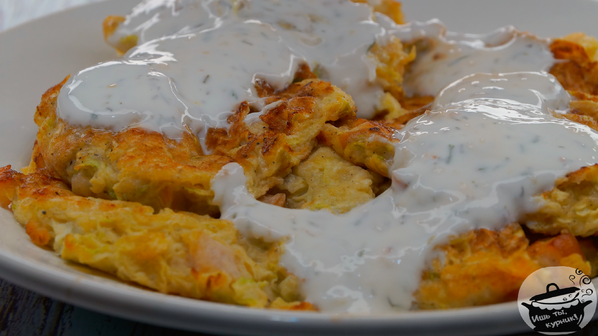 Ингредиенты: · кабачок - 1 шт.; · ветчина из индейки- 200 гр.; · яйцо - 1 шт.; · мука - 2 ст.л.; · соль - 2 щепотки; · чёрный молотый перец - по вкусу. Для соуса: · несладкий йогурт - 150 мл.; · укроп - 3 веточки; · чеснок - 2 зубчика. Приготовление: кабачок потереть на тёрке и посолить, через 15 минут хорошо отжать лишнюю жидкость. Ветчину мелко порезать или потереть на тёрке, добавить к кабачку. Также добавить муку и яйцо, тщательно перемешать. Выложить ложкой тонким слоем массу разогретую сковороду и обжарить до румяного цвета с каждой стороны. Для соуса: Укроп и чеснок измельчить, смешать со сметаной. Подавать оладьи горячими с соусом. Приятного аппетита!