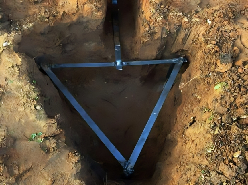 Конструкция такого заземления представляет собой равносторонний треугольник, по углам которого вертикально в землю забиты стальные уголки.