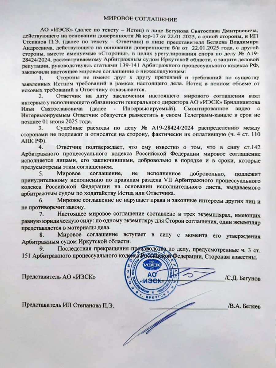 🔚 Судам с энергетиками — конец! Вчера была поставлена кульминационная точка в почти годовом судебном разбирательстве между мной и иркутскими энергетиками в лице «Иркутской электросетевой компании». Напомню, что иски были поданы именно ИЭСК в 2024 году в ответ на серию моих публикаций в телеграм-канале. Это были два разных иска, а цель истцов была доказать, что мои слова не соответствуют действительности. К тому же истец планировал взыскать с меня 10 миллионов рублей. Но в начале 2025 года мы вместе с тогдашним замдиректора ИЭСК Алексеем Дробашенко приняли совместное решение идти на мировое, идти в конструктив. Конструктив этот заключался главным образом в выстраивании диалога и открытости в отношении моих запросов со стороны электросетевой компании. И за это время мы успели сделать совместный фильм с участием Олега Причко про запрет майнинга в регионе, а сейчас готовим большой материал про работу самой ИЭСК. ⏳ Составление мировых соглашений — дело не одного дня, а процедура их согл