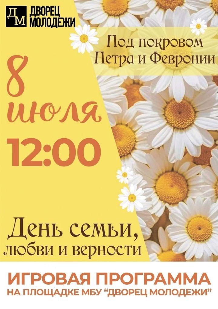 Дворец молодёжи организует праздничную программу, посвящённую Дню семьи, любви и верности «Под покровом Петра и Февронии». Организаторы обещают: будет весело. Юные участники узнают, во что в детстве играли их родители, а родители в свою очередь смогут принять участие в игровой программе, интересной детям. Мероприятие начнётся 8 июля, в 12.00, перед Дворцом молодёжи. Если погода внесёт коррективы, праздник всё равно состоится, но уже в фойе учреждения.