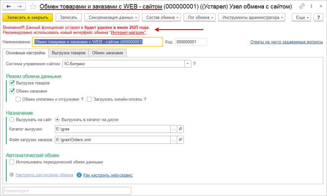 В программе «1С:Управление нашей фирмой» начиная с версии 3.0.12 с июля 2025 года устаревший механизм «Обмен с сайтом» будет автоматически заменен на обновленный «Интернет-магазин» и полностью удален из программы. Если при переходе к настройкам интеграции доступен заголовок «Обмен с сайтом», то используется старая версия обмена. Рекомендуется выполнить переход, настройки интеграции будут перенесены автоматически. Читайте инструкцию по интеграции с сайтами. _____________ Источник: 1С для эффективной торговли Следите за новостями 1С и торговли в нашем Telegram-каналe.