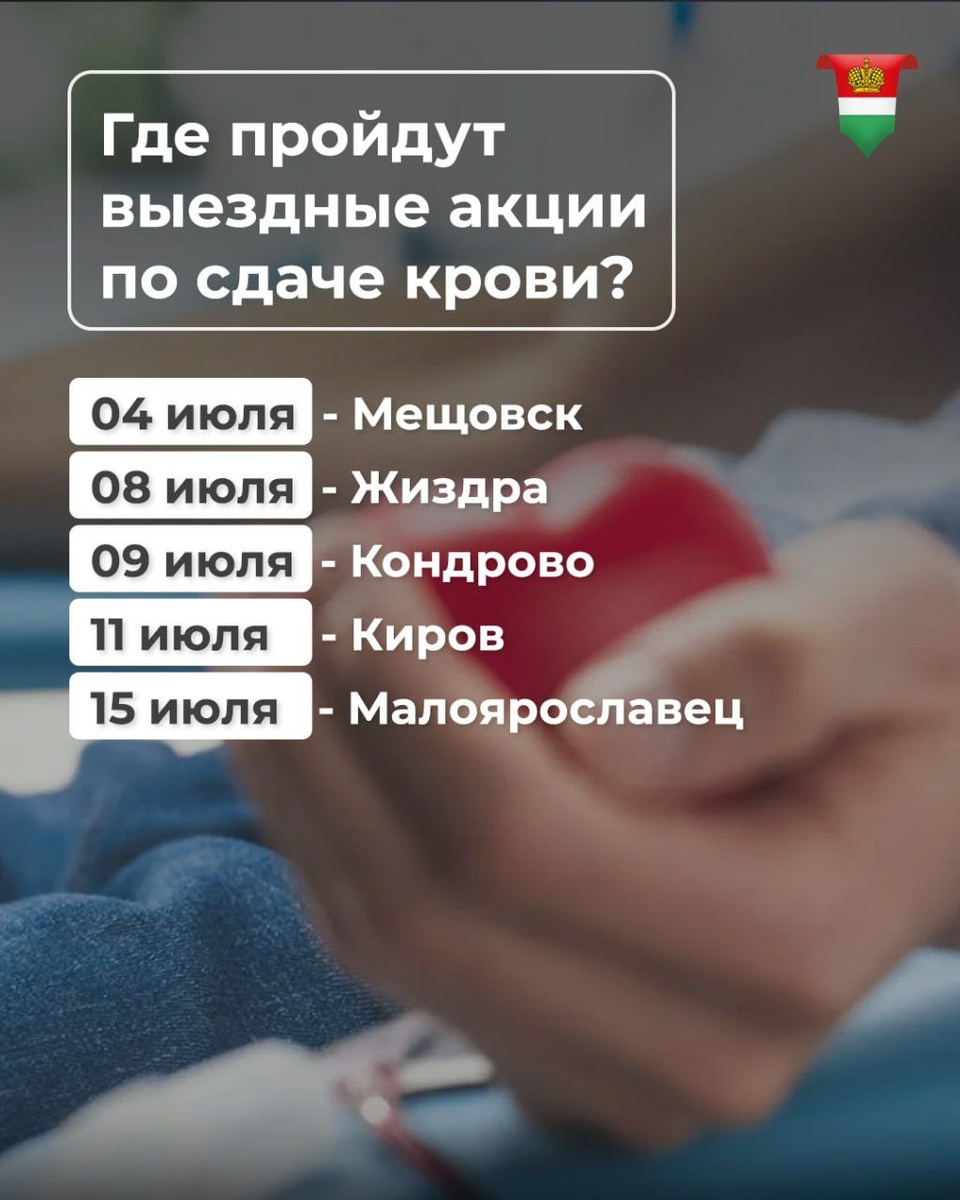 🟢Где донорам можно сдать кровь? Желающие стать донорами могут посетить Калужскую областную станцию переливания крови в Калуге. Она работает с понедельника по пятницу на улице Максима Горького, 71. Посетителей принимают с 8:00 до 13:00. С собой нужно взять паспорт и СНИЛС. Перед сдачей крови рекомендуется лёгкий завтрак, состоящий, например, из хлеба, сладкого чая или фруктов, кроме бананов. Накануне и в день сдачи крови запрещено употреблять жирную, жареную, острую и копченую пищу, колбасу, а также мясо, рыбу, молочку, яйца, масло, шоколад и орехи. За 48 часов нельзя употреблять алкоголь, а за 72 часа — принимать аспирин и анальгетики. За час до сдачи воздержитесь от курения. В регионе также работает выездная станция переливания. С её графиком можно ознакомиться в наших карточках. Станция в эти дни будет находиться на территории центральных районных и межрайонных больниц. ❤️ Главный официальный канал Калужской области. Подпишись