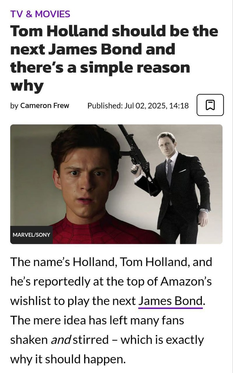 Том Холланд может стать новым Джеймсом Бондом — по информации инсайдеров, именно он рассматривается как главный претендент на роль легендарного суперагента. Права на франшизу недавно перешли к Amazon, которые уже анонсировали запуск нового фильма. Режиссёром проекта выступит Дени Вильнёв, известный по «Дюне», а Холланд активно рассматривается на главную роль.