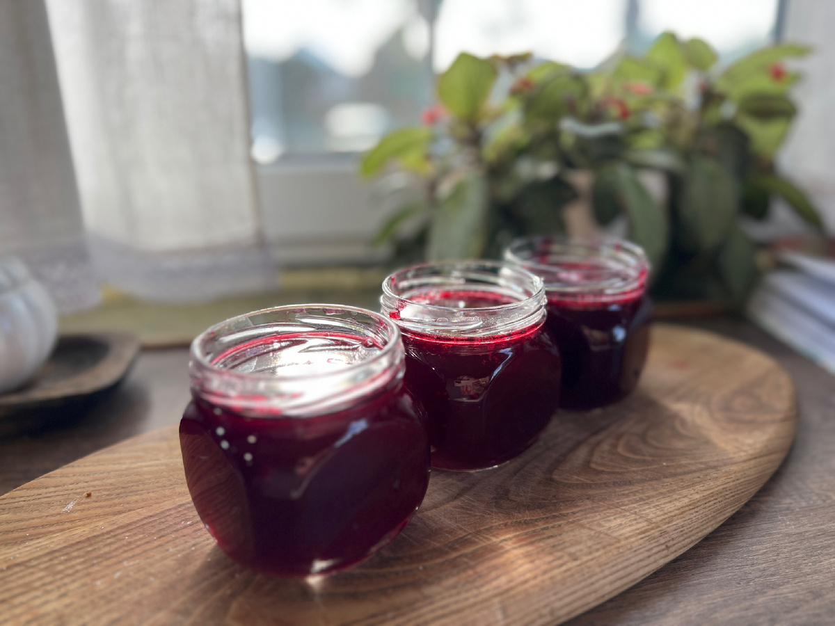 Смородину мою, засыпаю в кастрюлю прямо с веточками,чуть разминаю толкушкой, чтоб выделился сок и ставлю на огонь, накрываю крышкой.Распариваю минут 5 на медленном огне.Несколько раз перемешиваю. Как только смородина закипела-снимаю с плиты.Сразу перекладываю в мелкое сито и в блюдце стекает сок, нужно протирать, приминать,чтобы весь сок максимально остался в чаше и снимаю остатки снизу сита- здесь самое большое количество пектина. Жмых можно еще отжать через марлю.Измеряю сколько получилось сока. Сахара беру на 1л. сока-750 г. сахара. То есть не 1:1, а сахара всегда меньше. Добавляю сахар в сок и на плиту, закрываю крышкой, довожу до кипения и кипячу 1 минуту. Сок должен чуть побулькивать. Ни в коем случае не стоит долго кипятить, так как пектин разрушается и желе не получится плотным. Пенка при перемешивании вся растворится. Разливаю по стерильным банкам и оставляю открытым на сутки, прикрыв полотенцем, а уже остывшее желе закрываю крышками.Попробуйте!!! Приятного аппетита!!!