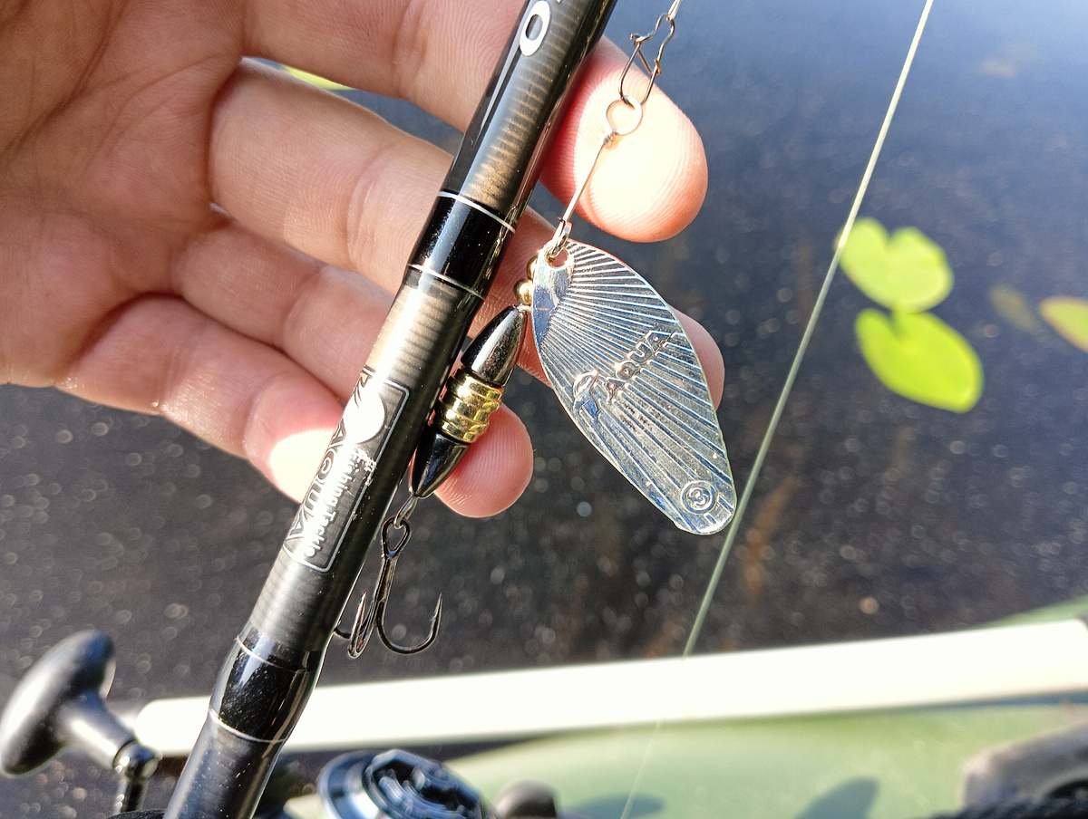 Выбор времени для рыбалки оказался оптимальным. Тёплая погода и отсутствие высокой травы создали идеальные условия для ловли. Особенно эффективным оказался выбор приманки — вертушка AQUA ESTI Shell 3, которая продемонстрировала: