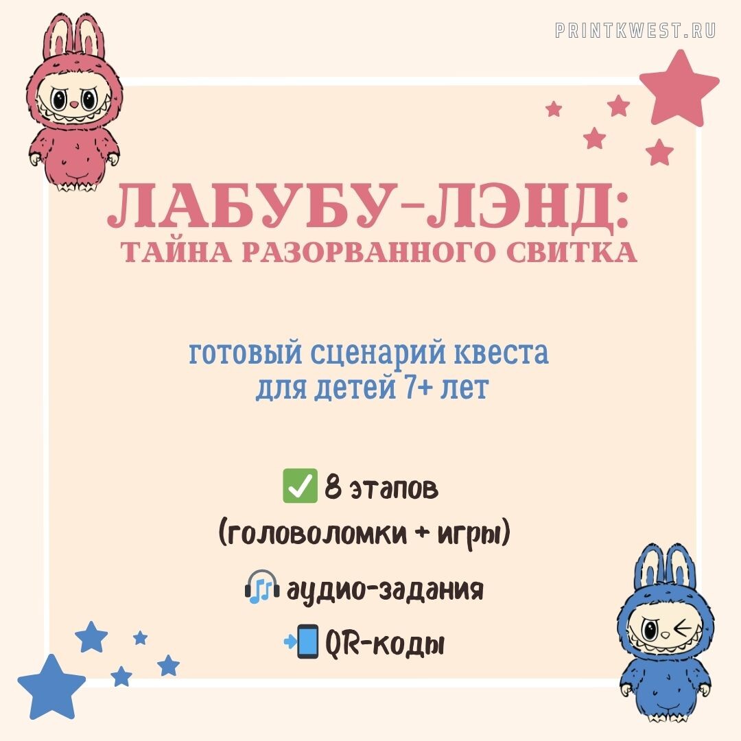 Это не просто головоломки — это аудиоприключение с играми, загадками и монстриками, которые сами не знают, что творят! 😜 Участников ждёт: 🔹 Изучение лабубу-языка (аудио-задание от самого Короля Бубуми Десятого 🎤👑). 🔹 Танцы под ритм королевских тапок (Туманный Мямлик случайно повесил их на Колесо Баланса и забыл... Бу-бу-топы пустились в пляс и нарушили равновесие во всём Лабубу-лэнде! 💃👟🌀). 🔹 Составление магических слов, которые укажут на Хранителей (найдёте слово — кричите «Бу-Бу-Бонг!» — и вперёд за приключениями! 🗣✨). 🔹 И многое другое весёлое и невероятное! Например, в начале квеста каждый получает паспорт жителя страны, где нужно вписать имя со слогом «БУ».... 📜 Сюжетная завязка: Ветер времени разорвал Великий Свиток Лабубу-лэнда — и вот-вот случится кошмар: исчезнут смех, конфеты и даже воздушные шарики! 🎈😱 Чтобы всё исправить, нужно найти фрагменты Свитка у Хранителей — монстриков, которые сами вечно попадают в курьёзные ситуации. 📌 Технические детали: 👥 Количест