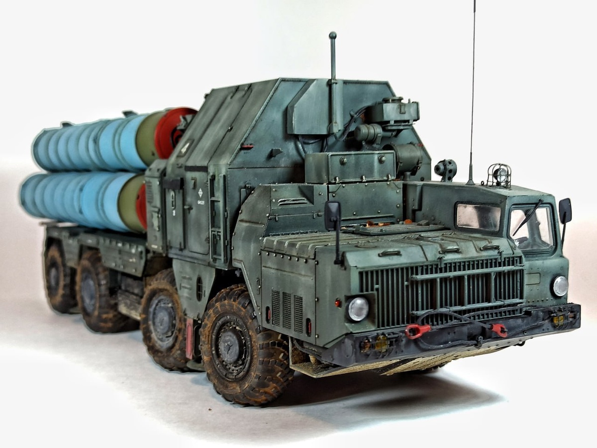 С-300 Седьмой Trumpeter, 1:35 От автора: "Пожалуй, одна из самых сложных строек для меня. Крупная модель с большим количеством деталей - более 1100. Классический трумпетер - неплохая стыковка и качество литья, однако присутствуют неточности и ошибки инструкции, нарушение логики сборки и порядка действий. В этой стройке мне захотелось воплотить несколько идей - в первую очередь это касалось проводки. Её на машине оказалось на удивление много. Были использованы различные материалы разного диаметра для имитации гофры, проводов и кабелей питания. Также из допов были использованы смоляные колёса под нагрузкой, латунный антенный ввод Р-123 с самой антенной, листья :) Красил спиртовым акрилом от Джима. Очень хотелось окрасить модель в цвет серии НЦ и результат мне очень понравился. В работе с краской проблем не было, за исключением того, что она очень густая. Не напасёшься растворителя). Для везеринга использовал пасты от Ганзы, масленки от Хаси, оилбрашеры от АК и добавил в некоторых ме
