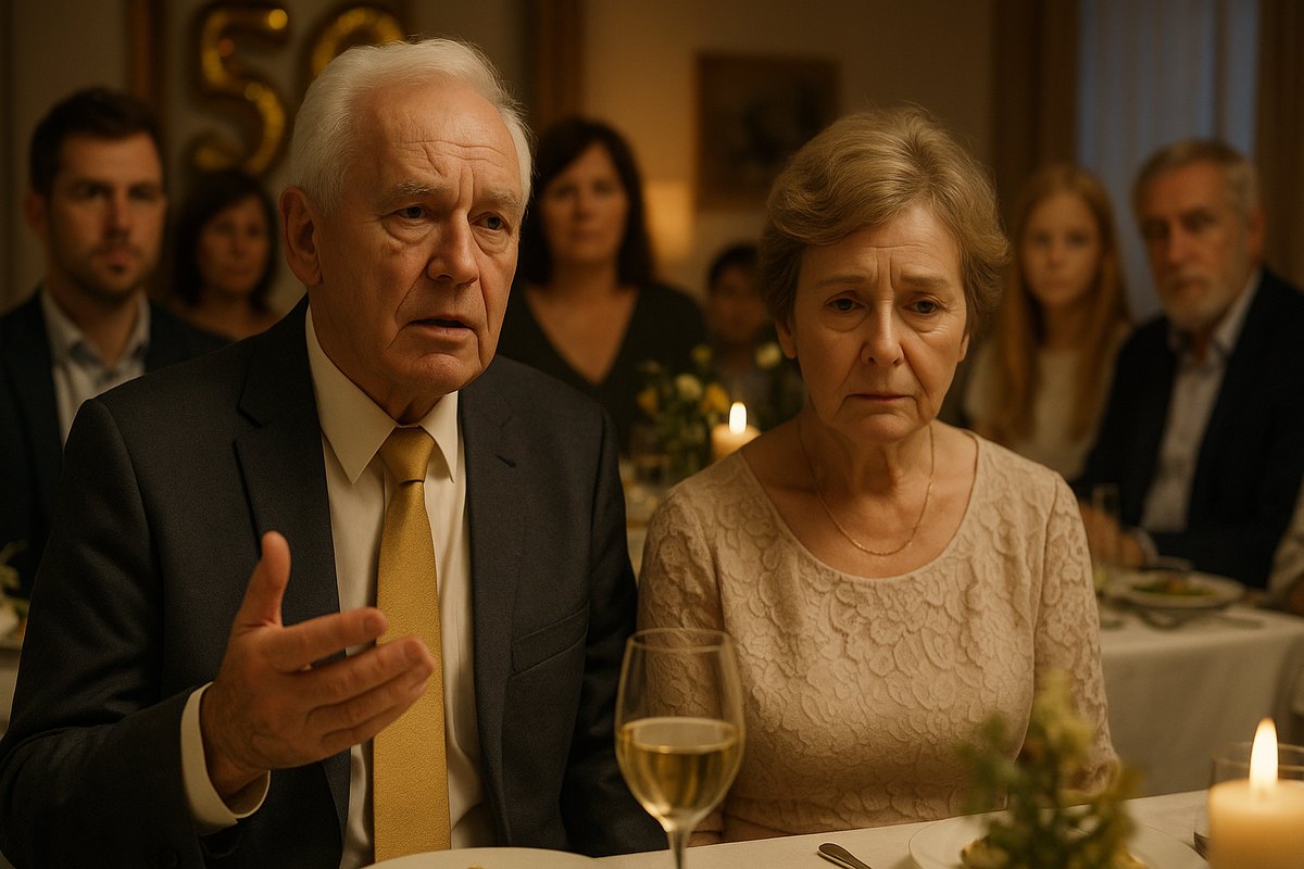 Громкие аплодисменты затихли, бокалы наполовину пусты, лица гостей сияют улыбками. Пятьдесят лет вместе — золотая свадьба. За длинным праздничным столом сидят дети, внуки, друзья семьи. В центре — виновники торжества: Михаил и Валентина. Он в строгом костюме с золотистым галстуком, она — в кремовом платье, с аккуратной причёской, скромно улыбается.