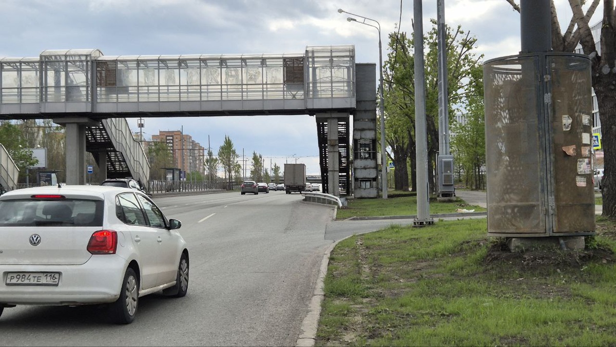 2️⃣ Перенесемся чуть выше - на пересечение проспекта Победы, ул. Ак.Глушко и ул. П.Полушкина и рассмотрим надземный пешеходный переход, а точнее организацию проезжих частей проспекта под ним. Напомним, что сам переход построен еще в нулевых, а вот проспект Победы пережил реконструкцию непосредственно перед Универсиадой-2013. ⚠️Один из итогов реконструкции - на фото: проспект тогда расширили, но, как видно на фото, не совсем и не везде. Нет, это не разгонная полоса при выезде с ул. Петра Полушкина - после перехода проезжая часть снова уширяется на одну полосу. 🆘Это - банальная экономия "на спичках" - нежелание реконструировать сам переход, приводя его габариты в соответствии с изменениями габаритов проезжих частей. ▶️Сначала на магистральной внутригородской дороге, где залогом хорошей пропускной способности является равномерность потока, создали бутылочные горлышки. ⏩А затем нанесли разметку [на фото ее нет, а вот на космических снимках очень даже есть] явно с благими целями - о