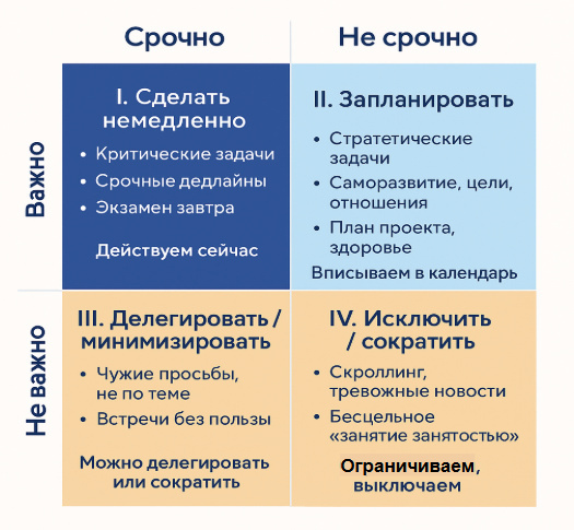 Квадрант I: Срочно и важно — дедлайны, форс-мажоры, экзамены, задачи, которые нельзя отложить без последствий → Требуют немедленного выполнения Квадрант II: Важно, но не срочно — обучение, здоровье, планирование, построение отношений, развитие → Часто откладываются, но именно они формируют долгосрочные результаты Квадрант III: Срочно, но не важно — чужие просьбы, неключевые встречи, отвлекающие зад