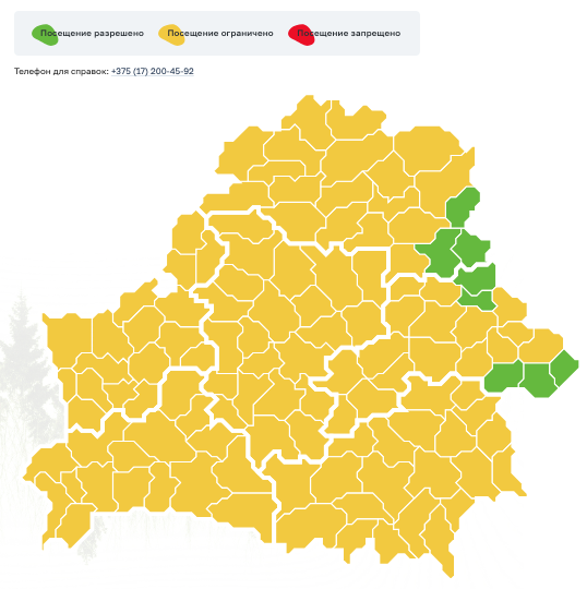 Ограничений нет только в восьми районах страны – Лиозненском, Оршанском, Дубровенском, Горецком, Дрибинском, Костюковичском, Хотимском и Краснопольском.