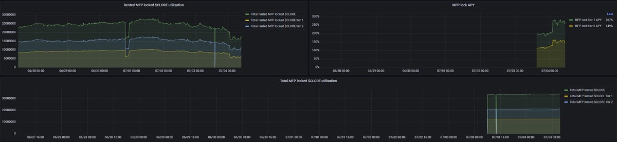 Я и многие другие пользователи просили команду CLORE добавить в опен дату (тык) общий залок монет по тирам. К нам прислушались и теперь в статистике появились два новых графика (показал на скрине). Общий залок монет по тир1 и тир2, а так же APY по тирам в реальном времени.