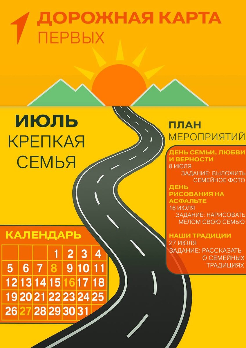 Привет, Первые! 💚 Вы продолжаете свое вдохновляющее путешествие по Дорожной карте Первых, и в этом месяце вас ждёт нечто особенное — ИЮЛЬ, месяц, посвящённый КРЕПКОЙ СЕМЬЕ! ✨ Это время, когда мечты становятся реальностью, когда семейные узы крепнут, а любовь и верность наполняют наши дни. В этом месяце мы будем делиться своими надеждами, вдохновляться друг другом и создавать уникальную атмосферу веры в себя и светлого будущего! Приготовьтесь к незабываемым событиям, которые напомнят о том, как важна семья в нашей жизни. Вот что вас ждёт в июле: 📅 8 июля — День Семьи, любви и верности Погрузитесь в волшебные моменты, выкладывая семейные фото, чтобы поделиться своей историей! 📅 16 июля — День рисования на асфальте Дайте волю творчеству, создав мелом на асфальте удивительные изображения вашей семьи! 📅 27 июля — Наши традиции Расскажите нам о своих семейных традициях, которые делают вашу жизнь уникальной и насыщенной! Присоединяйтесь к нам и сделайте этот месяц поистине незабыв