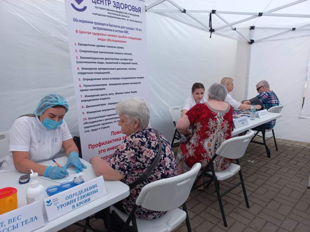 3 июля в рамках губернаторского проекта «Медицина на Дону» в Волгодонске открылся передвижной «Пункт здоровья», где любой желающий может пройти бесплатное экспресс-обследование. Первый день работы мобильного медицинского пункта прошел у входа в парк Победы со стороны почтамта. На площади Победы разместилась большая медицинская палатка с импровизированной регистратурой, где записывали данные всех желающих пройти обследование. В рамках четырехчасовой работы (с 9 до 13 часов) медицинские сотрудники проводили экспресс-тесты на глюкозу, измеряли артериальное давление, рост и вес для расчета индекса массы тела, определяли уровень кислорода в крови и снимали электрокардиограмму. Волонтеры предлагали питьевую воду всем ожидающим в очереди. После обследования с пациентами беседовали врач-кардиолог Виктория Порскал и врач-терапевт, руководитель «Центра здоровья» Светлана Корнева. -Наша цель — профилактика неинфекционных заболеваний. Мы выявляем факторы риска: курение, употребление алкоголя, недо