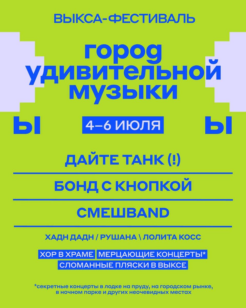 В этом году нам 15 лет — и мы отмечаем юбилей удивительным, звенящим и волнующим лайнапом. В программе: молодые, но уверенные, свежие, но уже любимые. Те, кто звучит в наушниках, на кухне, на танцполе — и вот теперь прозвучат в Выксе. Всё это не сон – открытие фестиваля ✨ «Бонд с кнопкой». Концерт в лесу Стартуем под инсталляцией «Всё это не сон» — с концерта группы «Бонд с кнопкой», авторов песен «Кухни» и «Камушки», которые наверняка играют у вас на повторе. ✨ Вечеринка «Сломанные пляски в Выксе» DJ-сеты от Николая Редькина («Брокен дэнс»), Антона Савенко («а можно потанцевальней?»), DJ Stonik1917, Kedr Livanskiy и выксунского диджея НЕКИЙТЫ. Танцы под соснами — бодрые, добрые и настоящие. Музыка по всему городу ✨ Мерцающие концерты Неожиданные места и новые форматы. Крыша пирожковой, ночной парк, автостанция, лодка на пруду — хедлайнеры фестиваля и выксунские музыканты удивят нас внезапными выступлениями по всему городу. ✨ Хор в храме Инсталляция из колоколов и пронзительная музыка