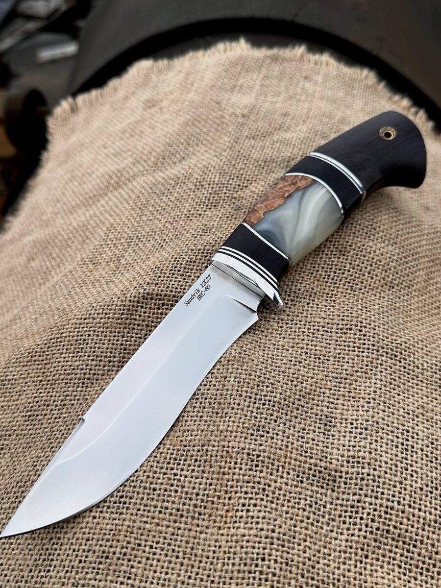 Охотничий нож «Варан» из шведской нержавеющей стали Sandvik 12C12, спуски от середины клинка в маленькую вогнутую линзу, что делает рез агрессивным, бритвенная заточка. Материал рукояти: черный граб, стабилизированная карельская береза коричневая и акрил белый с мозаичным пином. Твердость клинка (HRC): 60 Цена ножа: 10.500 рублей, со скидкой: 8.500 рублей В комплекте идут ножны из натуральной кожи. Можем сделать формованные ножны +6000 рублей. Для заказа писать на @Nazarklinokbot или по тел +79101343831 WhatsApp/Viber
