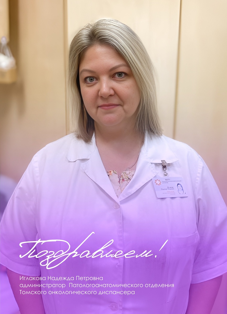 Сегодня юбилей отмечает Иглакова Надежда Петровна — администратор патологоанатомического отделения. За шесть лет работы в Томском онкологическом диспансере Надежда Петровна зарекомендовала себя как ответственный и доброжелательный сотрудник. От всей души поздравляем Надежду Петровну с юбилеем. Желаем крепкого здоровья, душевного тепла и благополучия! Пусть в жизни будет как можно больше счастливых моментов и поводов для гордости!