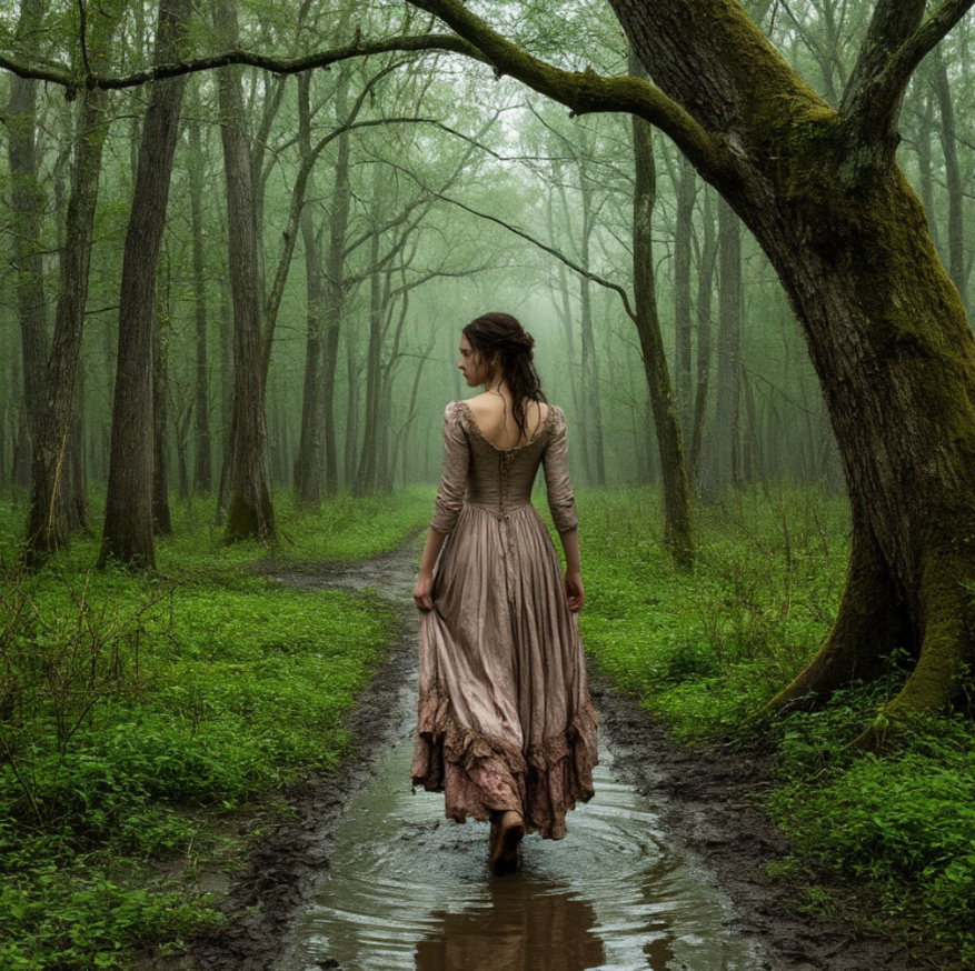 Всё дальше и дальше, дерево за деревом, кочка за кочкой. Она давно уже перестала следить за тем, куда наступают её ноги. Шёлковые туфли промокли, подол платья изорвался и испачкался.