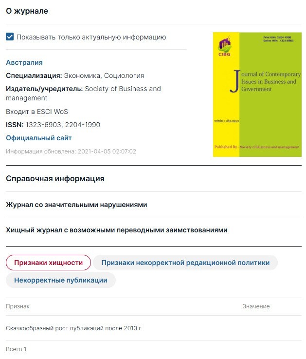 Journal of Contemporary Issues in Business and Government Австралия Специализация: Экономика, Социология Издатель/учредитель: Society of Business and management Входит в ESCI WoS https://www.dissernet.org/magazine/journal_of_contemporary_issues_in_business_and_government