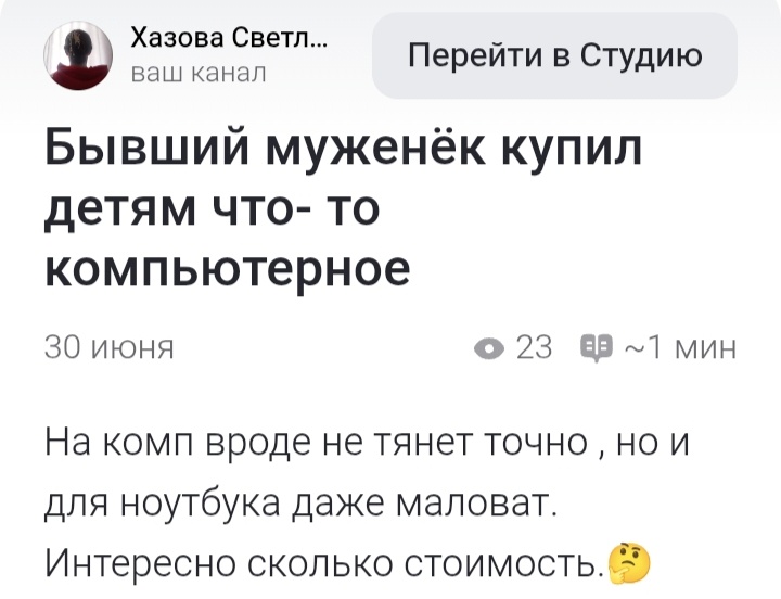 На общую кухню приобрётена им плита , не себе в комнату. Прошлый раз у соседей вырубило электричество после включения старой плиты. Но не думаю, что это соседи метнулись ( прикиньте "умный " телефон это слово напечатал , вместо слова - скинулись , заботится так автоматика, возомнила себя творческой железякой 😂), так вот , это явно не соседи скинулись . Так что опять вопрос за чей счёт банкет? 🧐 Очень уж подозрительно выглядит появление в этой нехорошей квартире чего- то нового. В другом блоге , в котором я печатаю статьи тоже ( ну просто у меня сказать обычно есть чего на две статьи в день, одно радует , что не уголовные хоть), я рассказала про покупку папашкой ноута детям. Комментарии меня не успокоили, надеюсь не в кредиты прикуплено. Хотя.. Я ведь теперь не в браке, так что это уже не мои заботы. На детей не может ,вроде, свои долги навесить папашка.🤔 Вот скрин этой статьи, у меня пока нет возможности ссылки делать на статьи и блоги :