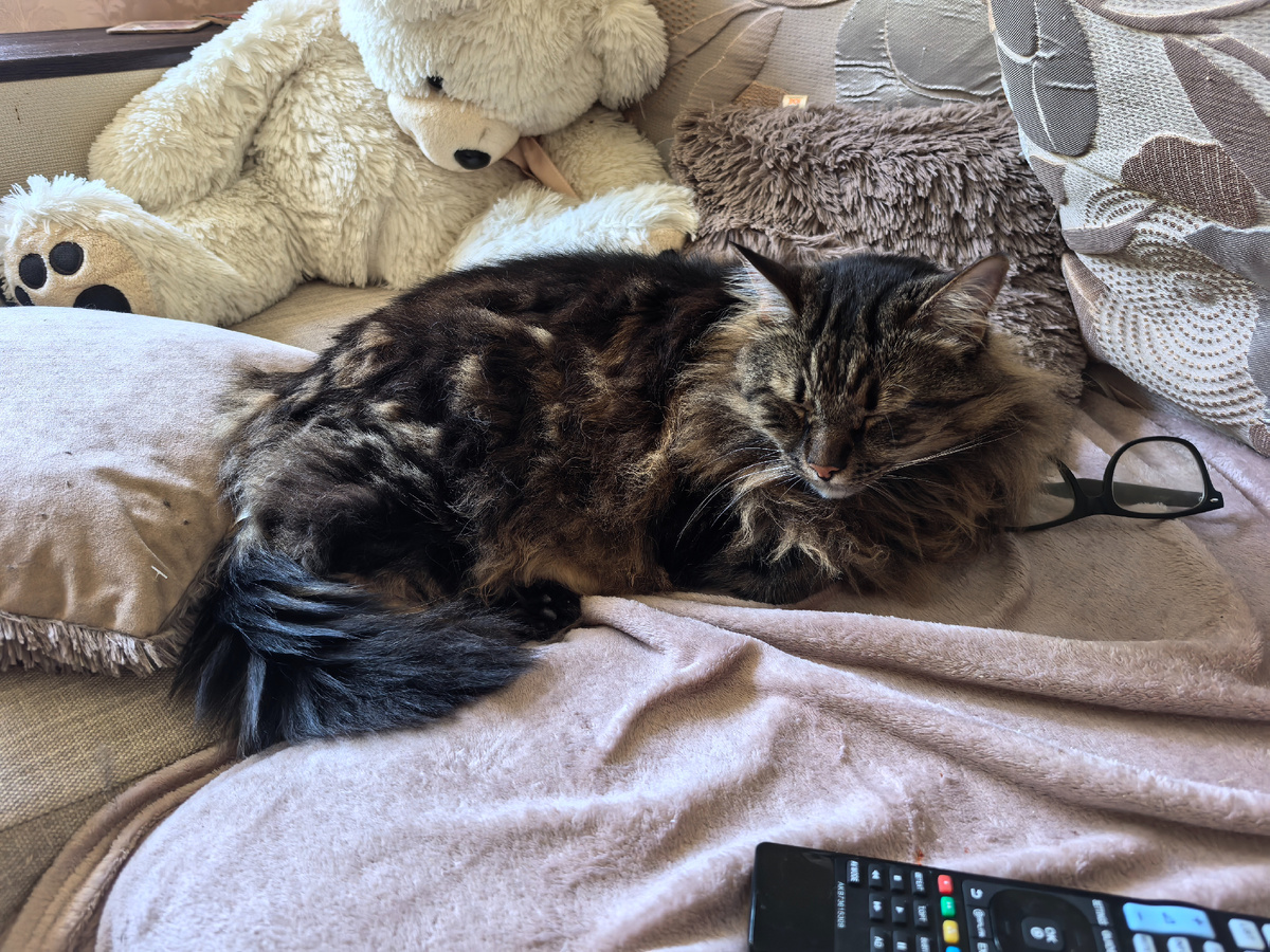 Всем привет! С вами Кузя Кусалочкин (он же царь Кузьма I). Сегодня я расскажу, как устроил себе день лени и кто украл кусь! Утро началось как обычно. Проснулась хозяйка, и я вместе с ней. На завтрак царю (то есть мне), как обычно, подавали паштет. На царской тарелке. На новые каналы я сейчас не подписываюсь. Дружить, забежать в гости времени нет. Потом я пошёл отдыхать, решил на диванчике с подушками поспать: Да, на диване бардак. Это хозяин не убирает после себя. А хозяйка уже устала убирать за нами (это она так постоянно говорит). Отдыхал себе спокойно, и тут хозяин присылает это фото: Это у них на работе День рождения был у одного сотрудника, и он пиццу заказал. Кажется, они украли мой кусь! Вот не стыдно воровать у котиков? Я переместился на гладильную доску и большую часть дня провёл на ней: А хозяйка занималась уборкой и стиркой. Она уже второй день собирает всё, на чём я лежал, и перестирывает, даже штору постирала (из которой я делал себе кабинет) и свою сидушку со стула. Ещё