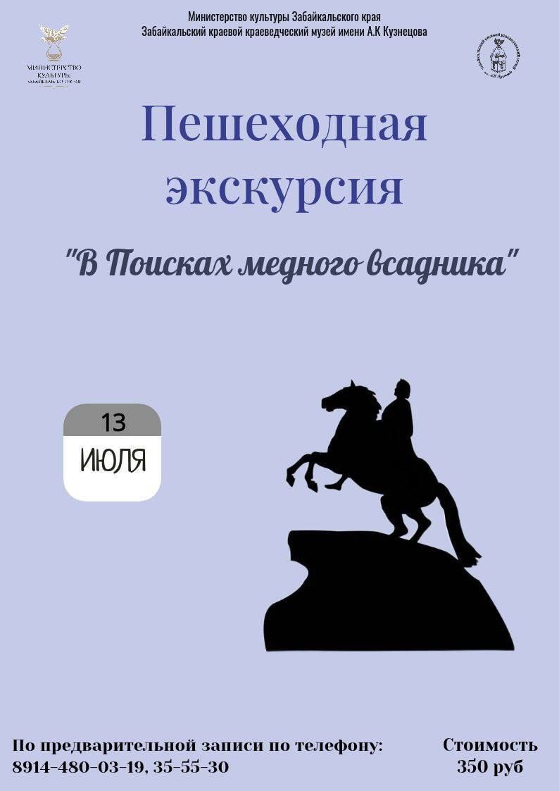 Приглашаем на пешеходную экскурсию "В поисках медного всадника" Маршрут проходит от краеведческого музея и далее по главным улицам города. Экскурсовод расскажет об исторических параллелях Читы и северной столицы. Вы узнаете, почему Читу многие сравнивают с Санкт-Петербургом. И есть ли действительно что-то общее у двух городов? 🕐13 июля, 11:00 📍ул. Бабушкина, 113 (у краеведческого музея) 🪙 350 рублей 🔑для записи звоните или пишите в мессенджерах и по телефону: 8914-480-03-19, 35-55-30 #Афиша Предложить публикацию:@zabkulisye_bot