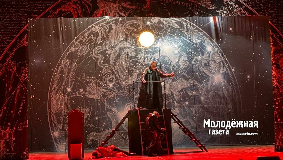 Порадовала сценография. На космическом заднике ярко сияла полная Луна, мерцали миллиарды звезд и созвездий, но это было не просто ночное небо, а старинная его карта с параллелями и меридианами, с надписями латиницей на французском — отсылка к родине автора пьесы. Прочитывался здесь еще и главный смысл сюжета: ослепительная Луна — это Роксана, окруженная тысячами посвященных ей стихотворных строк… Конструкция из трех лестниц в центре сцены получилась лаконичной и многофункциональной. Таким же был и скромный обелиск с крестом слева, трансформирующийся при повороте в стул, больше похожий на трон.
