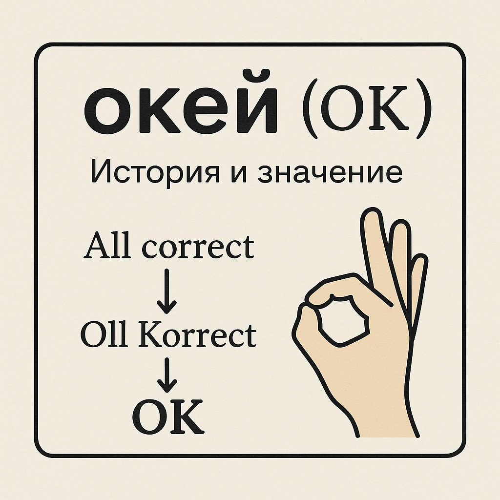 Слово «окей» (или «ОК») — одно из самых узнаваемых и универсальных слов в мире. Оно используется для выражения согласия, одобрения, подтверждения, нейтральной реакции и даже как способ закончить разговор. История и значение этого короткого слова куда интереснее, чем может показаться. Слово «ОК» появилось в США в 1830–1840-х годах, и вот теория его происхождения: В 1830-х годах в Бостоне появилась мода на ироничные сокращения фраз с намеренными орфографическими ошибками. И вот самый яркий пример: All correct — нормальное написание фразы «все правильно». Oll Korrect — шуточное, нарочито искаженное написание с ошибками.