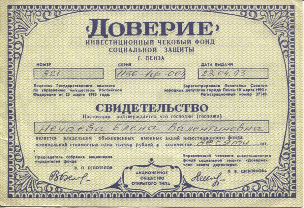 Заранее благодарен! Акционерное общество открытого типа " Инвестиционный чековый фонд социальной защиты"ДОВЕРИЕ", г. Пенза. Местонахождение: 440600, г. Пенза, ул. Московская, 56; тел.: (8412) 66-60-87. Аннотация деятельности: Аккумулирование приватизационных чеков http://cis.trifle.net›index.php… Справочник предприятий СНГ Распоряжением Комитета по управлению государственным имуществом Пензенской области от 20.11. 1996 № 132-р ЧИФ «Доверие» исключен из реестра чековых инвестиционных фондов. Распоряжением ФКЦБ России от 3 августа 1999 г. N 827-р исключен из Реестра инвестиционных фондов - бывший инвестиционный фонд, принявший на общем собрании