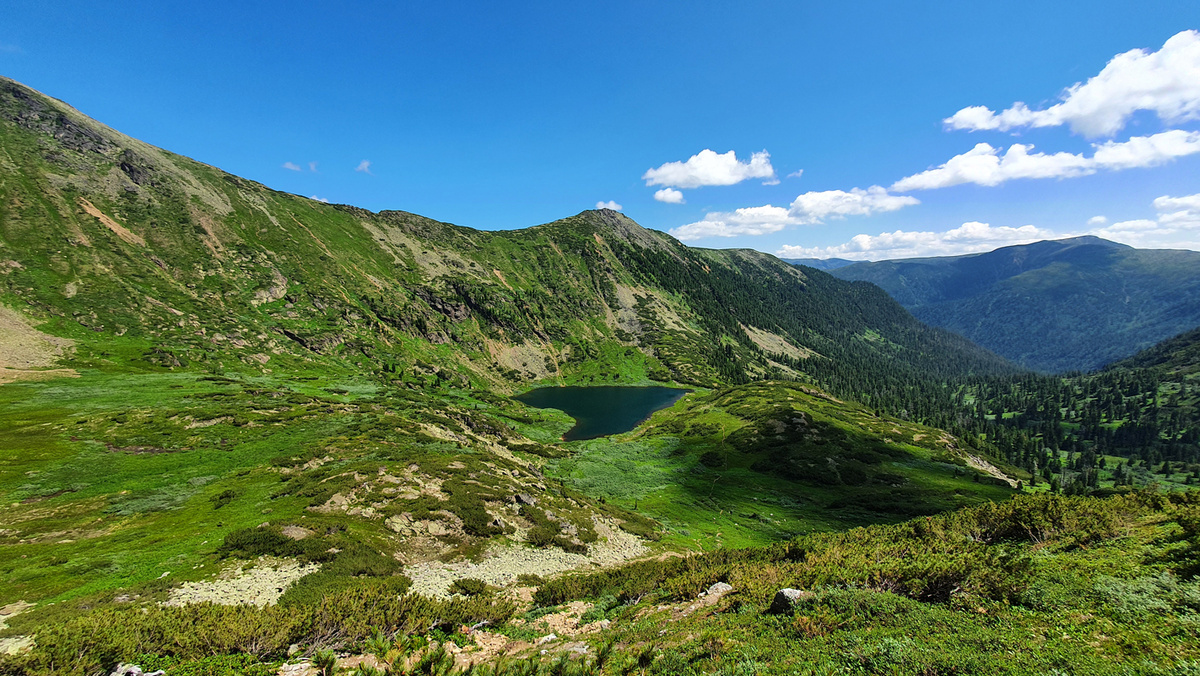 Уже в этом месте в хорошую погоду начинает открываться панорамный вид на Байкал. В цирке под пиком — удобные для стоянки поляны, которые извилисто прорезают узкие и глубокие природные каналы. Тут же — своеобразный сад камней, в конце которого — небольшое спокойное озеро. От него до пика буквально рукой подать — менее двух километров по прямой, но с учетом перепада высот (более 600 метров), подниматься придется порядка полутора часов. С пика виден и Байкал, и значительная часть других вершин Хамар-Дабана.
