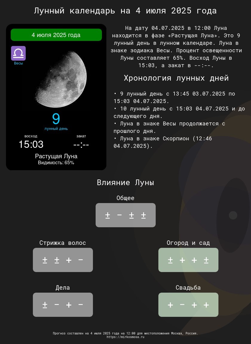 🔹🌗 Лунный календарь на 4 июля 2025 года — Что приготовила Луна? Подробнее