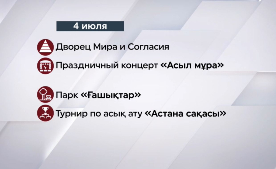 Астана готовится к грандиозному празднику! Больше 100 мероприятий ждут жителей и гостей города в честь Дня столицы, передает «24KZ». Главному городу страны 6 июля исполнится 27 лет. Фестивали, шоу, концерты, акции, спортивные турниры и театральные премьеры - в эти дни город наполнится музыкой, энергией и праздничным настроением. Уже сегодня во Дворце мира и согласия пройдёт концерт "Асыл мұра". На сцену выйдут лучшие казахстанские исполнители, кюйши и жыршы. А в парке "Ғашықтар" определят сильнейших на турнире по асық ату. Впервые в рамках Года рабочих профессий Государственный театр драмы и комедии имени Азербайжана Мамбетова представит спектакль "Армандар орындалады". Он пройдёт 5 и 6 июля. Особенность постановки - участие не только профессиональных актёров, но и представителей различных рабочих профессий. И, конечно, 6 июля кульминацией торжеств станет большой OPEN AIR концерт на территории стадиона "Астана Арена" с участием звёзд отечественной эстрады. В этот же день на ипподроме "